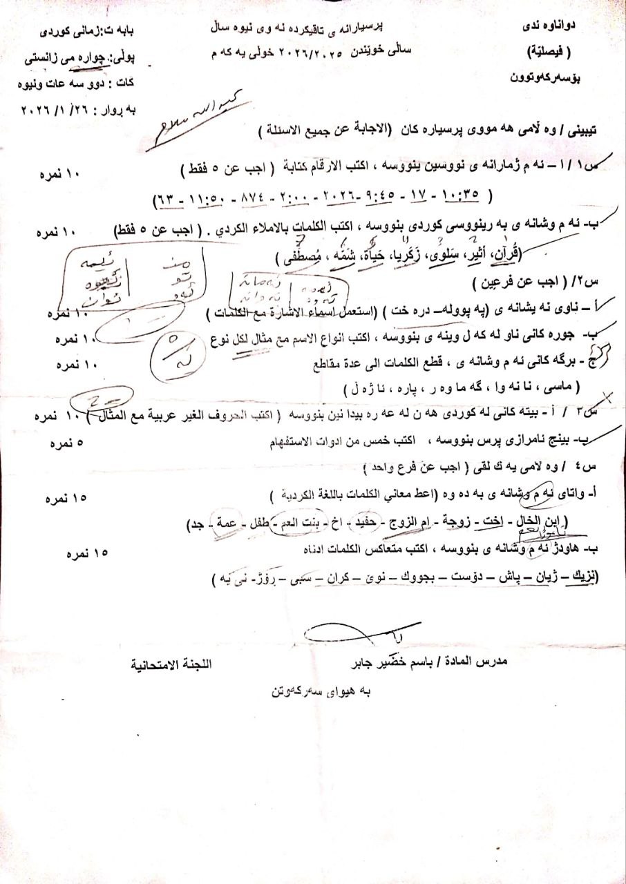 نسخة ورقة اسئلة الكردية للصف الرابع العلمي – نصف السنة 2025 ثانوية الفيصلية للمتفوقين
